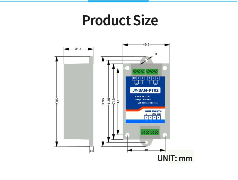 High precision 24 bit AD conversion resolution 0.01The temperature measure ment accuracy is 0.1℃Acquisition frequency 10HzSupport multi-channel simultaneous acquisitionThe device is compatible with twowire and three wire PT100 sensors
