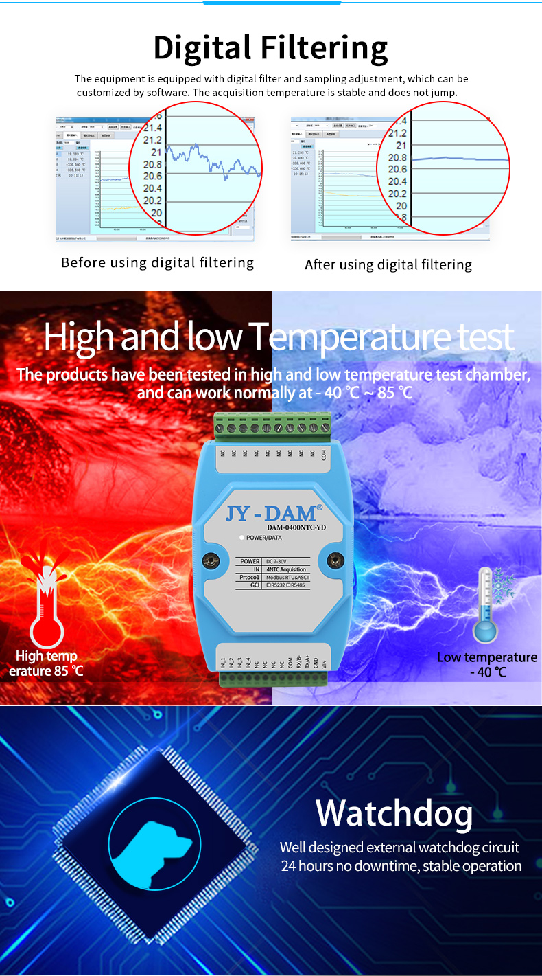 Industrial analog acquisition module, 4 analog inputs (4-20mA, 0-5V, 0-10V); Support RS232 or isolated RS485 communication interface; Standard Modbus RTU protocol; Support sending Modbus RTU / ASCII control command