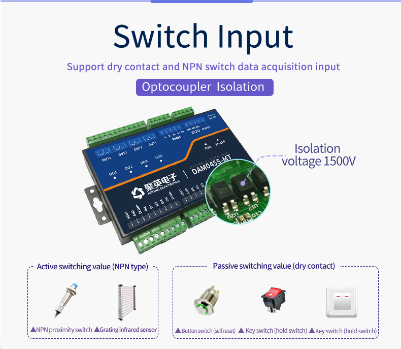 Industrial relay control board, 4-way relay control (do), 5-way analog acquisition (AI), 5-way switching value acquisition (DI), 4-way relay output; 5-way optocoupler input (5-24v); 5 channels of 12 bit resolution analog voltage input; Support RS232 or isolate...