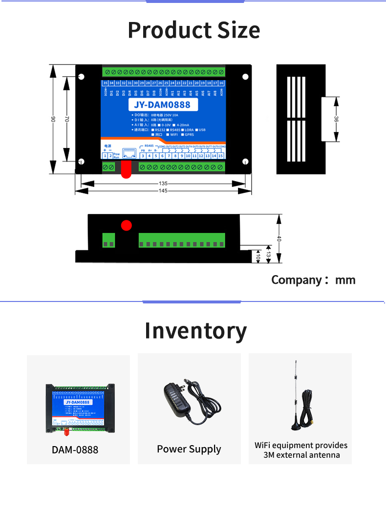 Dam0888 industrial cloud series network version, 8-way relay output (do), 8-way switching value acquisition (DI), 8-way analog value acquisition (AI), 8-way relay control output, contact isolation; 8-way switching value input (NPN / dry contact); 8-way analog ...