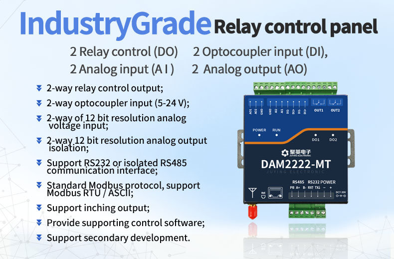 Industrial relay control board, 2-way relay control (do), 2-way analog acquisition (AL), 2-way switching value acquisition (DI), 2-way analog output and 2-way relay output; 2-way optocoupler input (5-24v); 2 channels of 12 bit resolution analog voltage and cur...