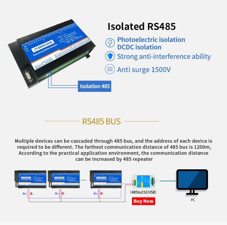 Industrial analog acquisition module, 32 analog inputs (4-20mA, 0-5V, 0-10V); 8 analog outputs (4-20mA, 0-5V, 0-10V); Support RS232 or isolated RS485 communication interface; Standard Modbus RTU protocol