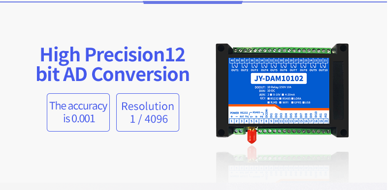 Dam10102 industrial network control module, 10 relay output (do), 10 switching value acquisition (DI), 2 analog value acquisition (DI), 10 relay control output, contact isolation; 12 channel switching value input; 2-way analog quantity (4-20ma.o-5v,