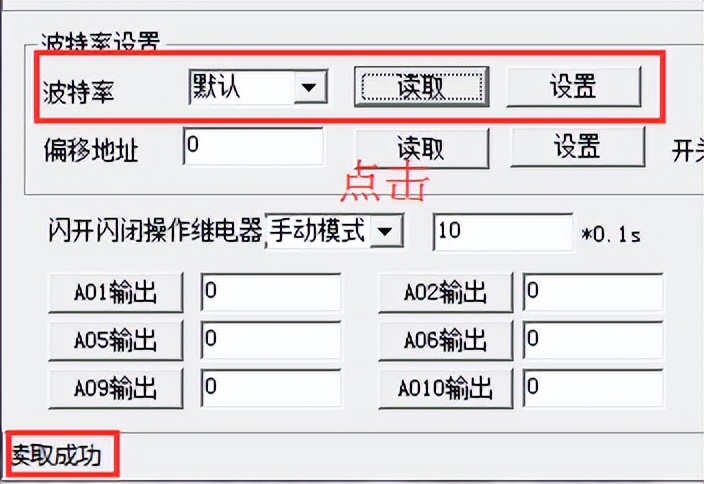 点击下方波特率设置栏的“读取”和“设置”就可以分别读取和设置波特率和地址,操作后需要重启设备和修改电脑串口设置。