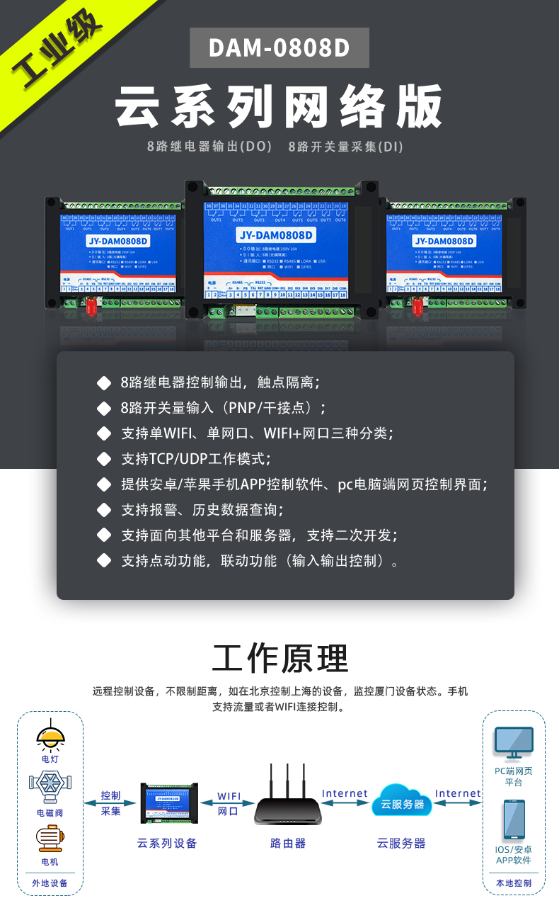工业级 云平台系列网络版,8路继电器输出(DO)8路开关量采集(DI),8路继电器控制输出,触点隔离;8路开关量输入(PNP/干接点);支持单WIFI、单网口、WIFI+网口三种分类;支持TCP/UDP工作模式;提供安卓/苹果手机APP控制软件、pc电脑端网页...