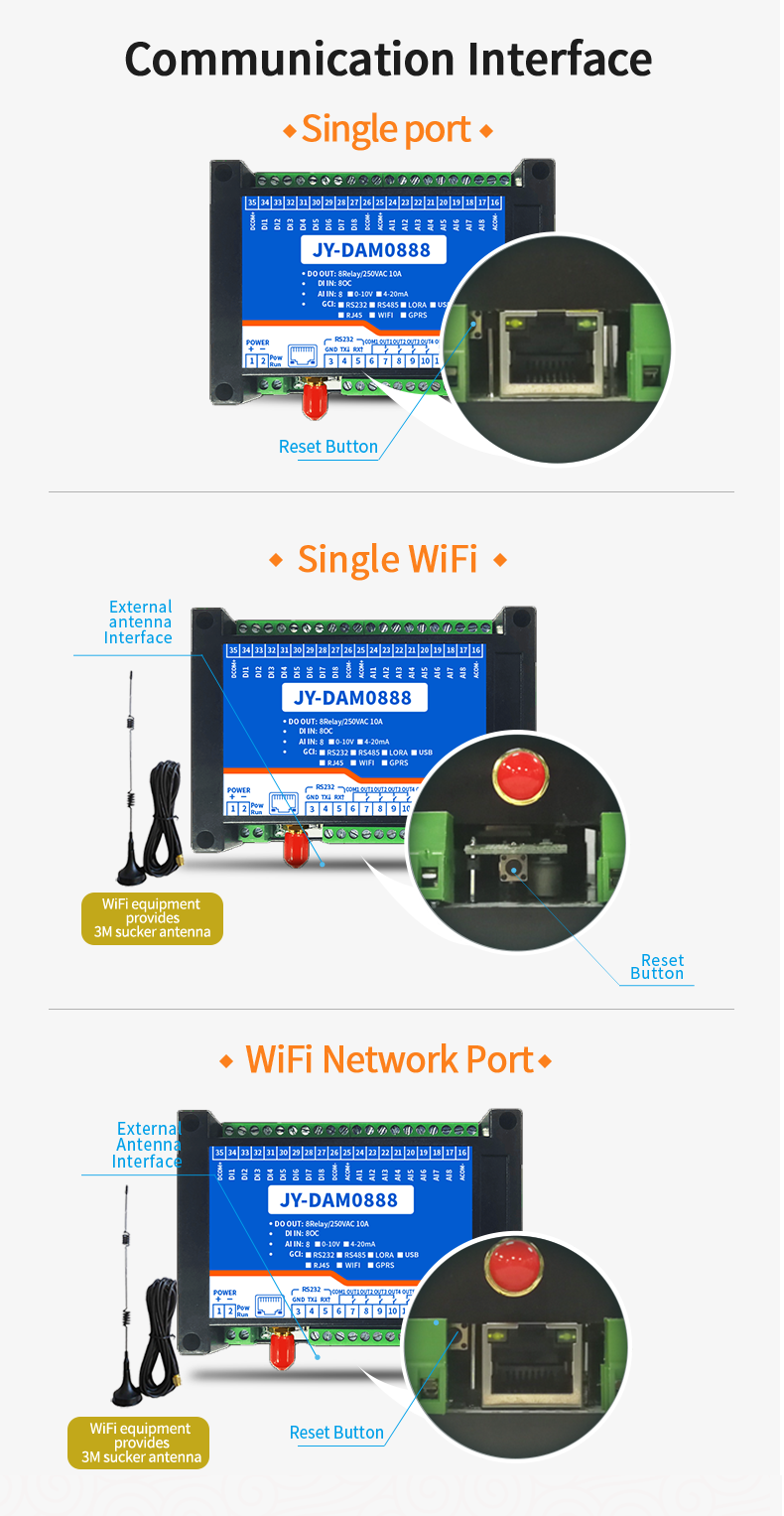 lndustrial grade Network Control Module,8 Relay output (DO)8 Switch data acquisition (DI),8Analog data acquisition(Al)DAM0888,8-Way relay control output, contact isolation;8-Way switch input;8-Way analog inputs;support single network port, single WiFi andnetwo...