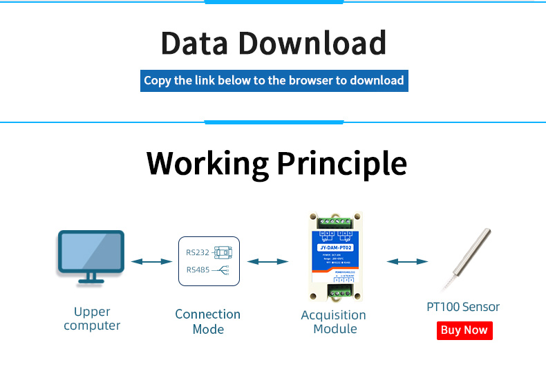 High precision 24 bit AD conversion resolution 0.01The temperature measure ment accuracy is 0.1℃Acquisition frequency 10HzSupport multi-channel simultaneous acquisitionThe device is compatible with twowire and three wire PT100 sensors