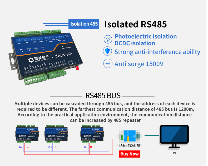 Industrial relay control board, 4-way relay control (do), 5-way analog acquisition (AI), 5-way switching value acquisition (DI), 4-way relay output; 5-way optocoupler input (5-24v); 5 channels of 12 bit resolution analog voltage input; Support RS232 or isolate...