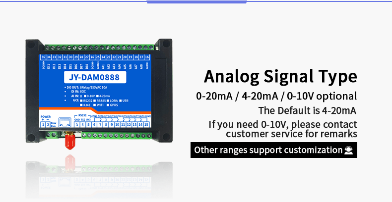 Dam0888 industrial network control module, 8-way relay output (do), 8-way switching value acquisition (DI), 8-way analog value acquisition (AL), 8-way relay control output, contact isolation; 8-way switching value input; 8 analog inputs; Support single network...