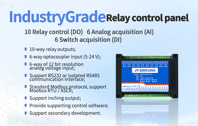 Industrial grade relay control board, 10 channels of relay control (do), 6 channels of switching value acquisition (DI), 6 channels of analog value acquisition (AI), 10 channels of relay control output, contact isolation; 6-way switching value input; 6 analog ...