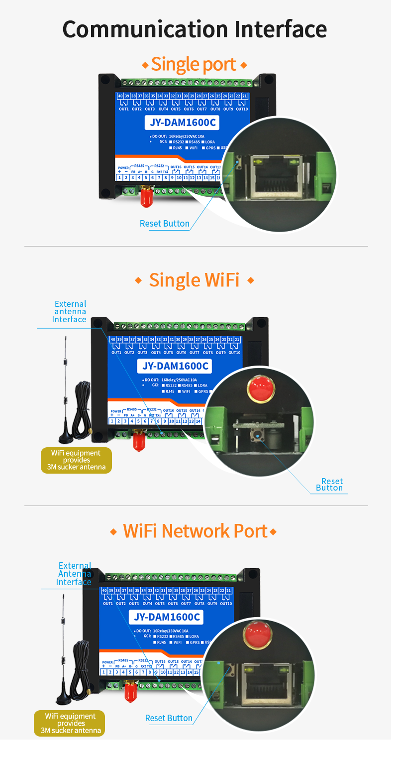 Dam1600c industrial network control module, 16 relay outputs (do), 16 relay control outputs, contact isolation; It supports three categories: single network port, single WiFi and network port + WiFi; Support TCP / UDP working mode; Provide Android mobile app c...