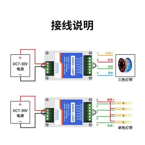 DAM04-LAMP是一款专用的4路调光模块,采用MOS管形式进行输出不同占空比的周期信号以实现电压的调节,可实现调光、调压、调速功能。上位机可使用485通讯进行控制设备,实现家居灯光明暗、颜色变化等功能。
