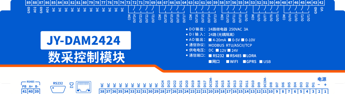 工业级继电器控制板 24路继电器控制(DO)24路开关量采集(DI)2路模拟量输出(AO)DAM2424,24路继电器控制输出,触电隔离;24路开关量输入;2路4-20mA/O-10V/0-5V可选;支持RS232,隔离RS485通讯接口;标准Modbus R...