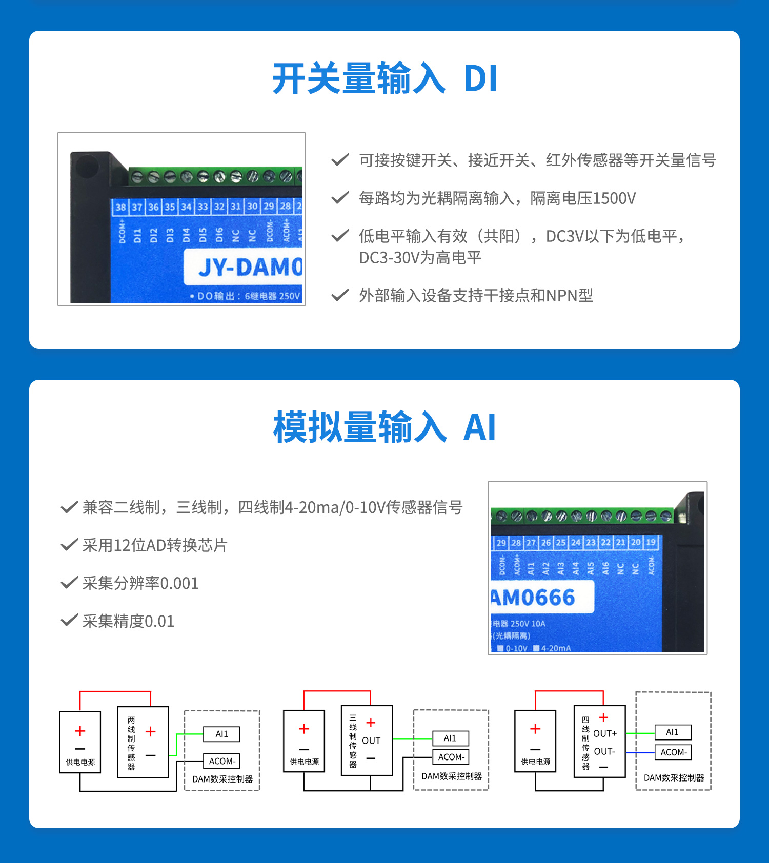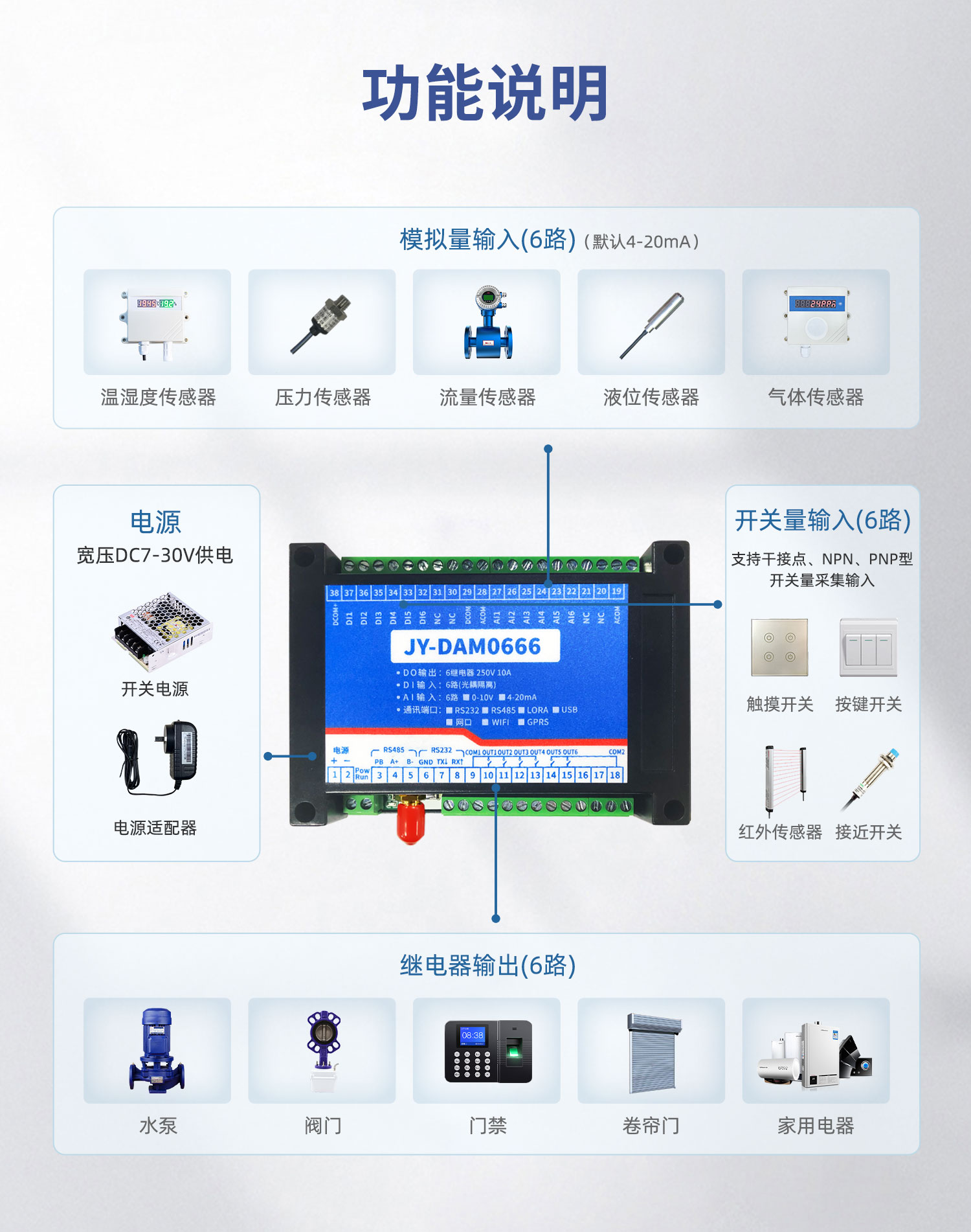 DAM-0666工业级 云系列网络版,6路继电器输出(DO)6路开关量采集(DI)6路模拟量采集(AI),6路继电器控制输出,触点隔离;6路开关量输入(NPN/干接点);6路模拟量(4-20mA、O-5V、0-10V)输入;支持单WIFI、单网口、WIFI+网...