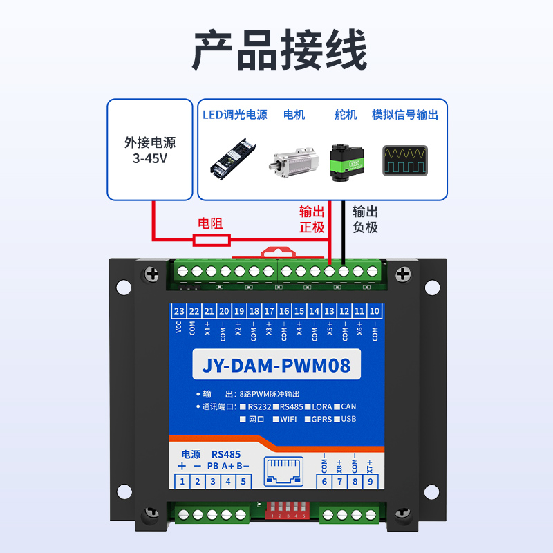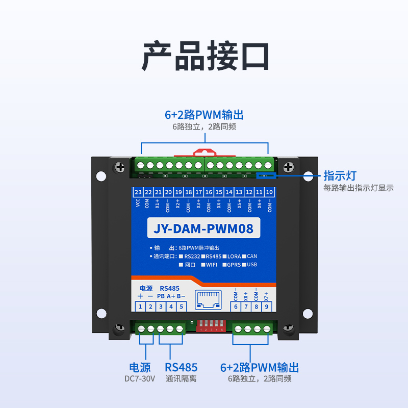 指示灯 | 1路红色 LED 指示 (不通信时大约2秒闪烁一次,通信时闪烁) 8路 PWM 输出指示灯(高频率视觉常亮) |